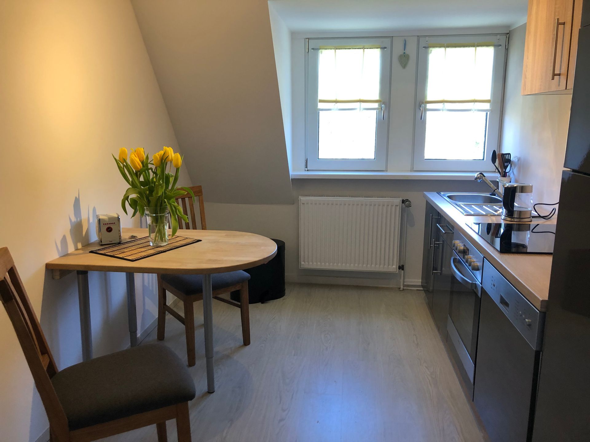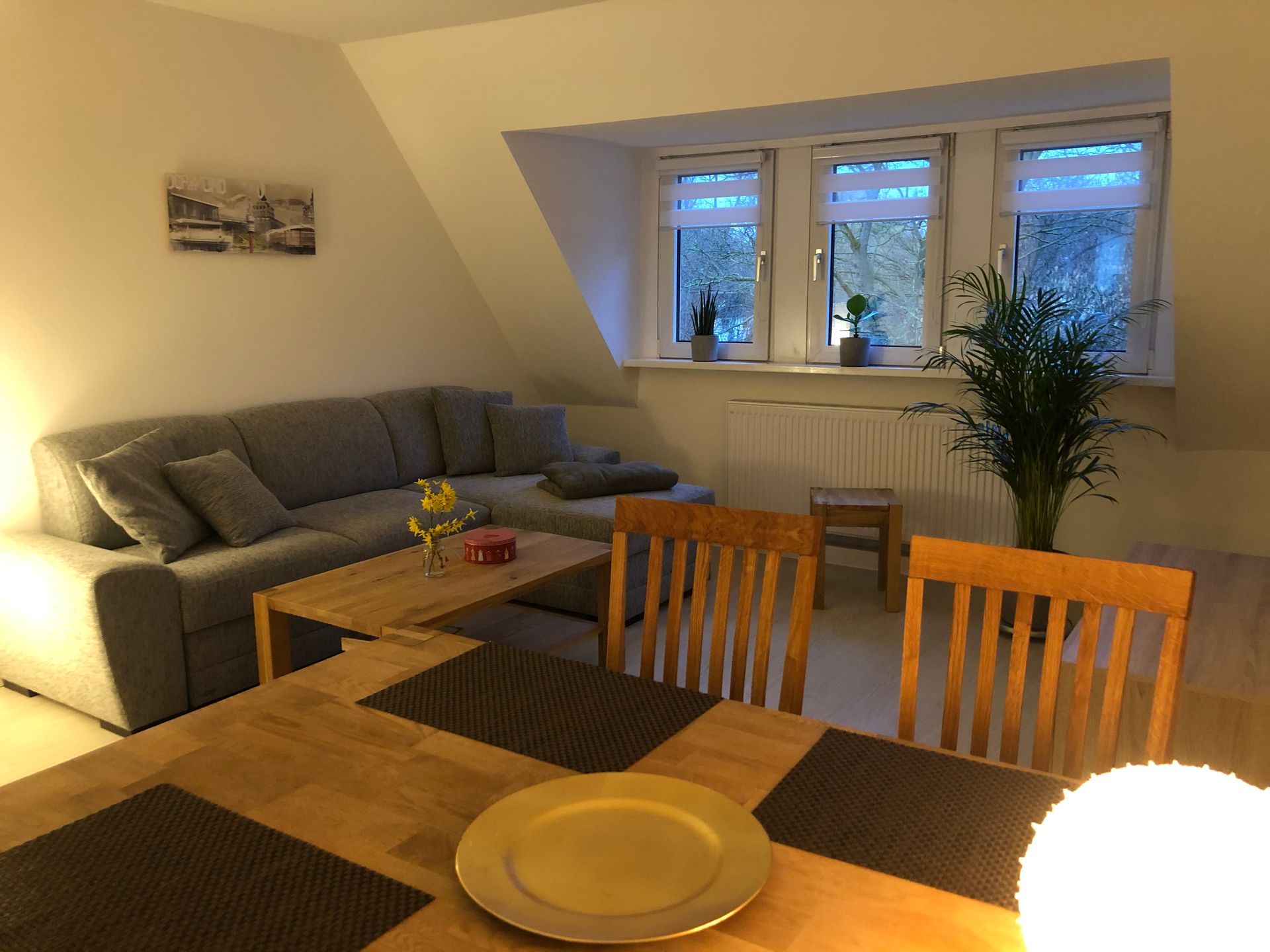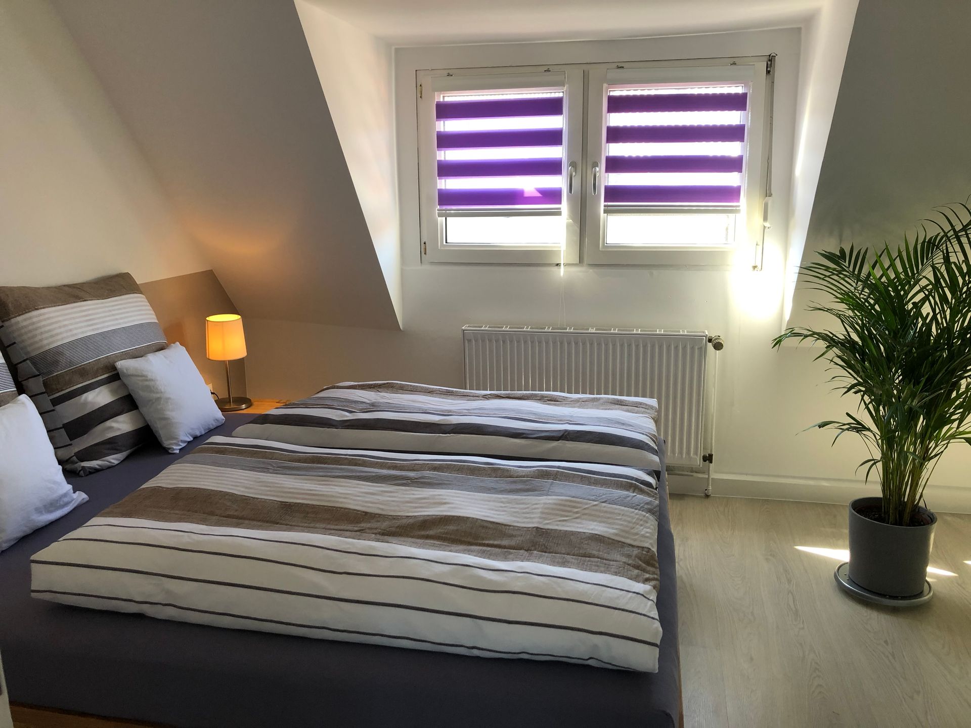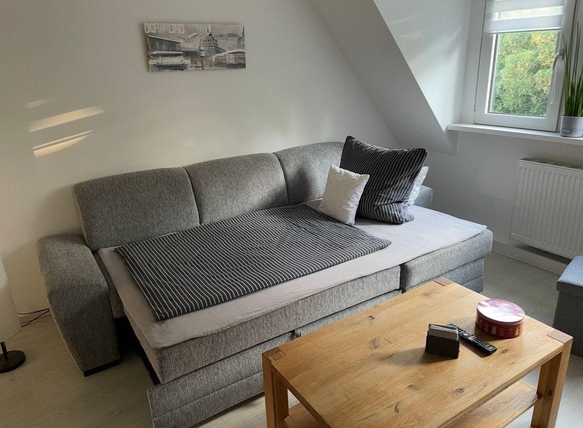 Die gemütliche Dachgeschosswohnung im 3-Familienhaus bietet Ihnen zwei Schlafräume mit Rolläden, eine voll ausgestattete Küche, ein Tageslicht-Bad mit Badewanne und ein Wohnzimmer mit einem Schlafsofa